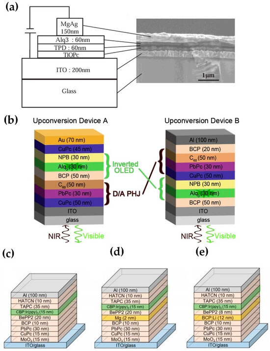 Several organic upconversion devices are composed of an NIR organic photodetector and an OLED based on fluorescent materials. An OLED containing titanyl phthalocyanine (TiOPc) and Alq3 layers has been fabricated (Figure 5a) [52], which uses the TiOPc layer as a hole-producing layer rather than a traditional buffer layer, and the structure upconverted light at 650 nm to green light at 530 nm, indicating its potential in red to green light conversion. The thickness of the TiOPc layer has a significant impact on device performance, with specific thicknesses (e.g., 60 nm) providing the best results reducing the hole injection barrier and improving the hole injection efficiency, indicating that the TiOPc layer has to be designed with appropriate thickness to obtain the best performance. In the following study, the researchers constructed a photoresponsive OLED with the TiOPc layer acting as a photoconductive layer to realize the up-conversion of near-IR light to blue at the low drive voltage [53]. The OLED structure is composed of several layers which are constructed on top of the TiOPc layer, starting with a 200-nm-thick ITO-coated glass substrate. The blue-emitting diode includes N,N′-diphenyl-N,N′-bis(1-naphthyl)-1,1′-biphenyl-4,4′-diamine (α-NPD) as the hole transport and emitting layer, and 2,9-dimethyl-4,7-diphenyl-1,10-phenanthroline (bathocuproine or BCP) as the electron transport and hole blocking layer. The EL efficiency of the photoresponsive OLED is significantly enhanced under laser irradiation, with the device efficiency in the lower current density region surpassing that of an OLED without the TiOPc layer. Upon irradiation with NIR light, the device demonstrates blue emission at a lower drive voltage (between 5 and 12 V), indicating its function as a light switch and/or up-converter from NIR light (1.6 eV) to blue light (2.6 eV). The device shows an enhancement in blue emission with NIR light irradiation at higher voltages (above 12 V), achieving an ON/OFF ratio of up to 1000. The results indicate that this photoresponsive OLED is a promising candidate for IR-visible image conversion applications due to its ability to act as a light-switching device and up-converter at low drive voltages.