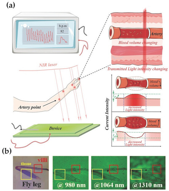 - He, Z.; Du, X.; Zheng, C.; Yu, X.; Lin, H.; Tao, S. High-Quality Artery Monitoring and Pathology Imaging Achieved by High-Performance Synchronous Electrical and Optical Output of Near-Infrared Organic Photodetector. Adv. Sci. 2022, 10, 2203870. [Google Scholar] [CrossRef]