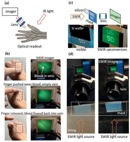 Li presents an organic upconversion imager with dual electronic and optical readout capabilities, capable of simultaneously recording vascular positions and blood flow pulses [23]. This imager provides a non-invasive method to visualize vascular structures and blood flow in real-time by converting SWIR light into visible light (shown in Figure 9a). This functionality is particularly valuable for medical diagnostics and continuous health monitoring, as it enables healthcare professionals to directly observe blood flow while also providing quantitative data through electronic readouts for automated analysis and long-term monitoring, thereby enhancing the precision and efficiency of medical procedures. Figure 9b shows a motion sequence of manipulating blood flow, as one pressed down on a vein to push away blood and then released the pressure to let blood flow back into the vein [23]. Moreover, the upconversion imager was also utilized for inspection or environmental monitoring with SWIR light. As shown in Figure 9c, the SWIR imager can clearly display the mask pattern (letter “UC”) covered by silicon wafers. Figure 9d demonstrates the effect of smog on visible and SWIR imaging. In the presence of smog, it’s difficult to identify the letters (EXIT) on the mask for the scatter of the visible light. However, SWIR light can penetrate the smog and be clearly presented by the upconversion imager.