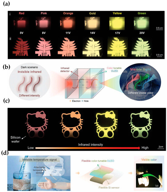 The tunability of the multicolor OLED is achieved through the careful selection of organic materials and device architecture, which enables the OLED to shift its emission from one color to another. They demonstrate that by modulating the driving conditions of the OLED (Figure 10a), different colors can be emitted from a single device, providing a flexible platform for multicolor displays. Integrating the multicolor OLED with the infrared sensor Si, the Si/CTOLED device realizes to convert the invisible infrared to visible light (Figure 10b). These interactive displays are designed to respond to IR light by altering their color output, thereby making invisible IR signals visible to the human eye through color changes. By providing a visual representation of IR signals, these interactive displays enable users to intuitively monitor and respond to environmental changes that are typically outside the visible spectrum. Different intensities of infrared light cause the Si sensor to generate different amounts of current, which causes the tunable multicolor OLED to emit different visible colors. The photos of Si/CTOLED devices at different infrared intensities are shown in Figure 10c. In addition, they proposed a wearable temperature visualization monitor due to the ability to sense the temperature of Si. This monitor leverages the color-tunable properties of the OLEDs to provide a visual representation of temperature changes. In this wearable device, the OLED display changes color in response to the wearer’s body temperature, allowing for real-time monitoring (Figure 10d). The color shift occurs due to the interaction between the temperature sensor and the OLED’s emission properties, which are finely tuned to respond to temperature variations. This capability is particularly useful in medical and fitness applications, where continuous and immediate feedback on body temperature is crucial. As shown in Figure 10d, the device is flexible and suitable to wear.