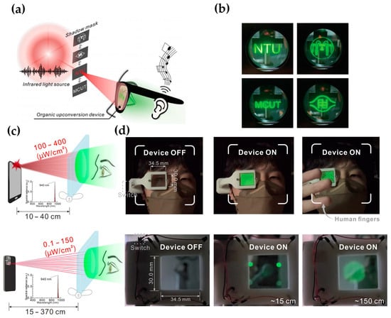 Shun-Wei Liu and co-workers also demonstrated the semi-transparent, pixel-free upconversion goggles with dual audio-visual communication (shown in Figure 11a) [76], which represents a significant advancement in wearable infrared imaging technology. These goggles are designed to integrate infrared visualization into wearable electronics, offering a novel solution for applications requiring both visual and audio communication. A distinguishing feature of these goggles is their ability to synchronize audio signal transmission with the light source, facilitating concurrent delivery of both audio and visual information, which enhances the functionality of the goggles, making them highly suitable for environments where integrated communication is essential. The goggles are capable of high-resolution infrared imaging and utilize large-area, semi-transparent OUDs to convert invisible infrared images into the visible spectrum. With an optimized device structure, these goggles achieve more than 30% efficiency in converting infrared photons to visible light, facilitated by the use of chloroaluminum phthalocyanine (ClAlPc) as the charge generation layer, which ensures effective charge dissociation and prolonged carrier lifetime. The potential applications of these goggles are vast, including night vision, security and surveillance, search and rescue operations, medical diagnostics, and industrial inspection. In night vision and security contexts, the goggles provide clear visual information in low-light conditions and can detect infrared signals in complete darkness, respectively, enhancing monitoring capabilities. In search and rescue scenarios, they enable the detection of individuals in low-visibility environments, while in medical diagnostics, they can identify infrared signatures indicative of various conditions. Additionally, in industrial settings, the goggles facilitate the inspection of machinery and infrastructure by detecting infrared emissions due to heat or other factors, with real-time audio-visual communication ensuring timely maintenance and repairs. Figure 11b shows the infrared images processed by the see-through upconversion goggles. Overall, these innovative goggles combine efficient infrared-to-visible upconversion with dual communication functionalities, making them a versatile tool for enhancing safety and efficiency across multiple fields.