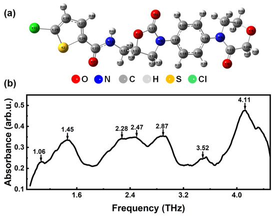 (a) The molecular structure of rivaroxaban. (b) Experimental THz absorption spectra of rivaroxaban in the range of 0.9–4.5 THz.