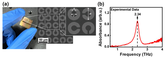Subsequently, we used standard photolithography to fabricate the metamaterial model, as shown in Figure 2a. A 5 nm chromium layer was added as an adhesion layer between the gold split-ring resonators and the silica substrate. Figure 3a presents the digital photo and optical images of the THz metamaterial biosensor. For each resonator, the gap width is g = 2.53 µm, the inner diameter is r = 7.56 µm, and the outer diameter is R = 17.61 µm. The actual sizes differ from the theoretical sizes by a maximum of 6.1%. Figure 3b shows an experimental resonance peak at 2.34 THz, closely matching the theoretical result of 2.30 THz, with an error below 1.7%. This slight variation is contributed to by differences in actual and theoretical sizes, as well as the imperfect conductivity of the gold layer in experiments compared to theoretical simulations.