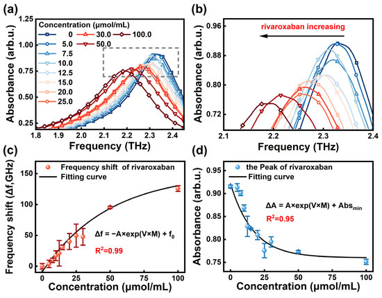 (a,b) The absorption spectra of rivaroxaban solutions with different concentrations. (c) The frequency shift as a function of the rivaroxaban concentration. (d) The absorbance changes as a function of the rivaroxaban concentration.