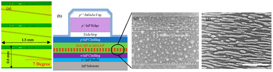 The QDash-SOA used in this work is an InP-based waveguide which is tilted 7° to the longitude direction of the chip to minimize facet reflection [12]. The SOAs were grown using Chemical Beam Epitaxy (CBE) on (001) InP substrates; growth details are given in ref. [38]. A core containing QDashes rather than QDots was used for these studies, although similar performance would be expected from Qdot-based devices, as seen for our laser structures [39]. Multilayer TiO2/SiO2 antireflection coatings were applied on both facets of the QDash-SOA, resulting in a <10−4 TE mode reflectivity [12]. The reflectivity of the TM mode is slightly higher than in TE mode, still less than 10−4. The top view of the QDash-SOA is shown in Figure 1a, with 3 QDash-SOA devices, while the whole bar contains 15 identical devices. The dimension of a single QDash-SOA chip is 1.5 mm × 0.8 mm × 0.1 mm. The cross section structure of the chip is shown in Figure 1b, and the active region of the QDash-SOA contains five layers of InAs QDashes with 10 nm In0.816Ga0.184As0.392P0.608 (1.15Q) barriers in a 350 nm thick 1.15Q core. The average QDash density in each active layer is around 1.5 × 1010 cm−2 [40]. The composition of InGaAsP was chosen to have a photoluminescence peak of 1.15 µm at 300 K. Figure 1c,d show the scanning electron microscope (SEM) image of the cross section and top view of QDash layer. This QDash structure provides both carrier and optical confinement. The design and fabrication details of the QDash-SOA are described in [11].
