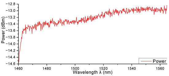 In this work, we mainly focused on the performance of our QDash-SOA as part of a communication system. All the gain and NF in this work is based on the FtF measurement. Before the measurement, we first determined the reference optical power without the QDash-SOA, i.e., directly connecting Point 1 and Point 2 in Figure 2a. The seed laser generates an input signal at the desired power with the wavelength being swept from 1460 nm to 1565 nm with a step size of 0.2 nm. The OSA records the output of the optical coupler and determines the peak power during each sweep step. The peak power spectrum density and its corresponding wavelength is recorded. We designate these data as Pref(λ) in dBm, which includes the power and loss information of the system in terms of wavelength. Figure 3 shows the reference power with a seed laser power of −10 dBm. There was about a 1.5 dB difference throughout the S+C band.