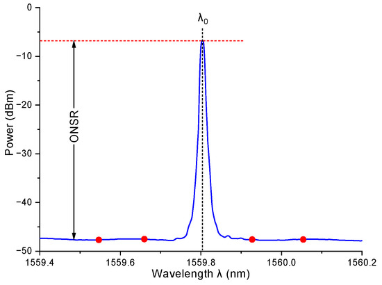 After we obtained the reference power, the QDash-SOA is added back to the system. The laser controller sets the temperature and bias current of the QDash-SOA to the desired value. Once the QDash-SOA is stabilized, the tunable laser generates a seed laser signal at the desired power and is swept from 1460 nm to 1565 nm with a step size of 0.2 nm. The seed laser is amplified by the SOA and then analyzed at the OSA. The spectrum at each laser input wavelength during the sweep was recorded in the OSA. An example of recorded power spectrum density is shown in Figure 4. The peak power and its wavelength are recorded as Pout(λ) in dBm. The ASE around the peak is also recorded as PASE(λ) in dBm, which is the average of four points around the peak power, separated by 0.2 nm. With the Pout(λ) and PASE(λ), we can calculate the optical signal-to-noise ratio (OSNR) at each wavelength, denoted as OSNR(λ), in dB: