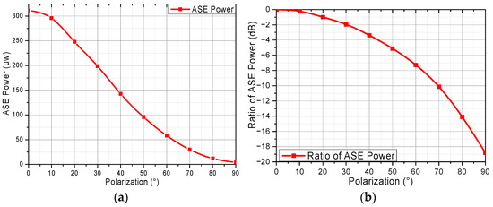 The reported QDash-SOA is highly polarized. The extinction ratio of ASE power is −18.8 dB. The relation between ASE power and polarization is shown in Figure 5a. The relation between ratio of ASE power and different polarization is shown in Figure 5b.