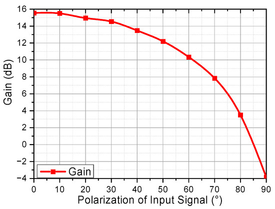 The gain of QDash-SOA is also highly polarization-dependent. The extinction ratio of gain is −19.4 dB. The relation between gain and polarization is shown in Figure 6.