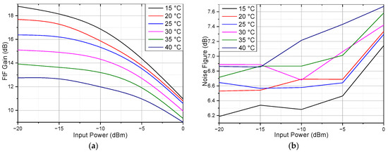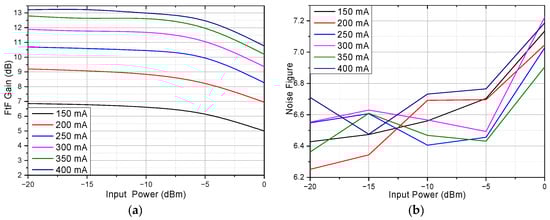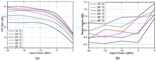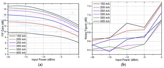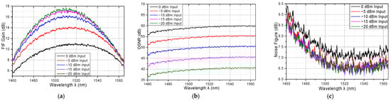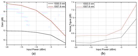 Figure 9a shows the relationship between input power and gain. Two wavelengths, 1507.8 nm and 1550.0 nm, are considered, where 1507.8 nm is the peak of the gain and 1550.0 nm is the most common wavelength used in communication. Figure 9b shows the relationship between input power and NF. The result shows that with higher input power, the gain will reduce due to saturation; the 1 dB gain compression power at 1550 nm and 1507.8 nm is around −4.5 dBm and −12.5 dBm, respectively. As for NF, when the input power is lower than −5 dBm, the NF is almost the same.