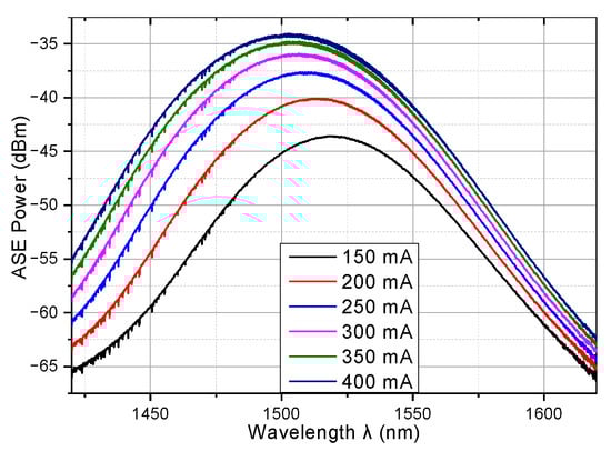 Figure 10. The ASE output of the QDash-SOA at different bias currents.