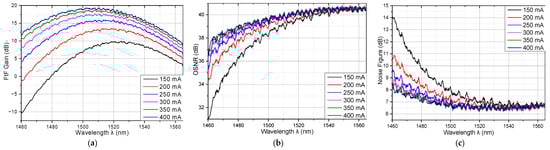 Figure 11. The (a) FtF gain, (b) OSNR, and (c) NF of the QDash-SOA versus wavelength for different bias currents.