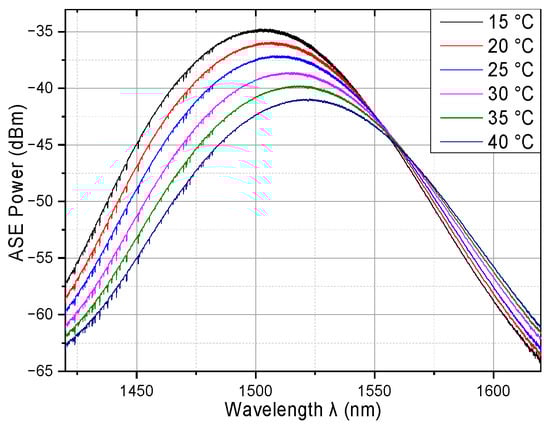 In this series of measurements, the current is kept at 300 mA while the temperature of the QDash-SOA is changed from 15 °C to 40 °C. Figure 14 shows the ASE output of the QDash-SOA at different temperatures. It shows that with the increase in temperature, the ASE power is decreased, the center frequency of the ASE is red shifted from 1503.9 nm to 1523.6 nm, and the 3 dB bandwidth of the ASE is also increased from 56.3 nm to 63.7 nm. The ripple of the QDash-SOA is decreased with increasing temperature, from 0.9 dB at 15 °C to 0.2 dB at 40 °C, due to the drop in gain.