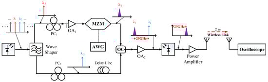 To further verify the performance of the QDash-SOA, it is integrated into the heterodyne-detected mmWave over fibre link shown in Figure 18. The laser source is a 29 GHz spaced multi-wavelength QDash-MLL, which is the same as the one used in [42]. Then, wavelengths are separated and filtered by a wave shaper (II-VI 16000A), filtering λ1 at 1543.476 nm and λ2 at 1543.248 nm into different branches. λ1 is amplified by optical amplifier 1 (OA1) and I/Q is modulated by an MZM SHF-46215B using a baseband QAM or OFDM I/Q signal generated by an arbitrary waveform generator (Keysight M8195A). To maintain an equal optical distance between λ1 and λ2, a delay line is introduced for λ2. Subsequently, a 50/50 optical coupler (OC) combines the two optical signals, which are then amplified by the OA2. The output undergoes heterodyne detection through a photonic detector (New Focus 1014). The received mmWave RF signal is subsequently amplified and transmitted over a 2 m wireless link. Finally, the received wireless signal is analyzed using an oscilloscope (Tektronix DPO73304SX). Two OAs in this system can be replaced by the QDash-SOA. However, due to the limitation of the current test bed, only one QDash-SOA can be applied into the system. We conduct two experiments that replace either OA1 or OA2 with the QDash-SOA the other OA was an EDFA (Amonics AEDFA-PA-35-B-FA).