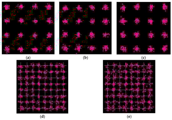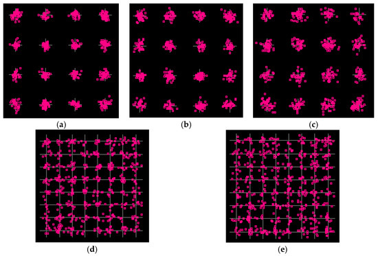 Figure 19. The constellations of received signal of (a) 16-QAM 2 Gbaud, (b) 16-QAM 4 Gbaud, (c) 16-QAM 6 Gbaud, (d) 64-QAM 2 Gbaud, and (e) 64-QAM 4 Gbaud.