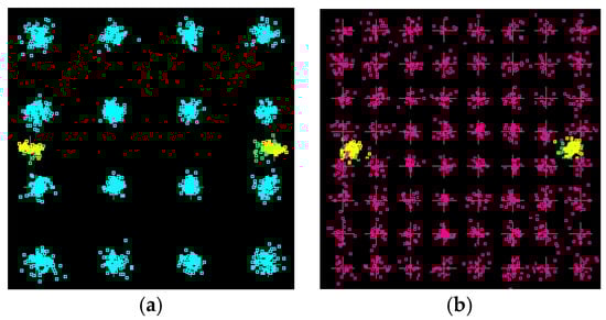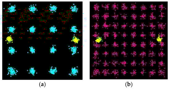 Figure 20. The constellations of received signal of (a) 16-QAM OFDM and (b) 64-QAM OFDM.