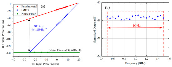 Figure 4a presents the test results for the spurious-free dynamic range (SFDR) of channel 1. The SFDR was measured using a dual-tone signal with central frequencies of 2.8 GHz and 2.81 GHz, down-converted by an LO signal with a central frequency of 3.5 GHz. Table 1 displays the SFDR values for the remaining sub-channels, which are all within the range of 94 dB·Hz2/3 to 96 dB·Hz2/3.