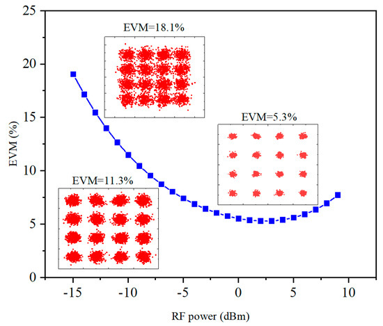 In order to demonstrate that the proposed channelizer can not only receive the broadband RF signal, but also restore the modulated RF signal, an experiment is carried out. A 16-State Quadrature Amplitude Modulation (16QAM) signal with a center frequency of 9.5 GHz is modulated by Quadrature Phase Shift Keying (QPSK) with the symbol rate of 50 MSym/s. After channelization, the IF signal is demodulated by the vector signal analyzer; the constellation diagram is shown in Figure 8. When the power of the input RF signal changes from −15 dBm to −2 dBm, the Error Vector Magnitude (EVM) gradually decreases and reaches the minimum value of 5.3%, which is the best point of communication. When the power of the RF signal changes from −2 dBm to 10 dBm, the EVM begins to increase, which is caused by high-order intermodulation distortion.