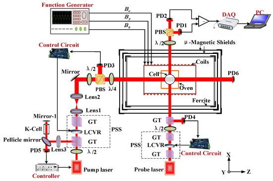 The pump beam is emitted by a distributed Bragg reflector (DBR) laser, and its wavelength is locked to the D1 transition line of K atoms (770.108 nm) with the saturation absorption frequency stabilization technology. The pump laser passes through a power stabilization system (PSS), a beam expansion system, and a quarter-wave plate before entering the vapor cell to polarize the alkali metal atoms. The power stabilization system includes a pair of Glan-Taylor prisms (GT), a liquid crystal variable retarder (LCVR), a half-wave plate (), a polarizing beam splitter (PBS), a photodiode (PD), and a circuit control system. The pump light power can be set via the power stabilization system. The probe beam is generated by a distributed feedback (DFB) diode laser, with its wavelength tuned 0.3 nm away from the D1 line of Rb atoms to ensure a larger scale factor. After passing through a power stabilization system, it enters the vapor cell to detect the component of the electronic polarization along the x-axis. The entire balanced differential detection module includes a half-wave plate (), a polarizing beam splitter (PBS), and two photodetectors (PDs). This module effectively suppresses common-mode noise. All experimental data are ultimately collected by a high-resolution data acquisition system (NI-USB 4431) and transmitted to the host computer for display.
