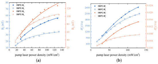 To facilitate the verification of the equivalent model and the calculation of output noise , we first test , , , and at vapor cell temperatures of 180 °C and 190 °C under different pump laser power densities. can be obtained by finding the minimum response amplitude of the CM to a sinusoidal alternating magnetic field , while is equal to [30]. can be calculated from the step response parameters of the CM to a magnetic field [31]. can be directly measured using the free induction decay (FID) method [32]. The measurement results of these parameters are shown in Figure 2. Figure 2a presents the measurements of and , while Figure 2b shows the measurements of and . It is evident that all four parameters increase with the rising pump light power density, which aligns with our anticipated behavior.