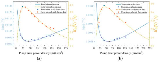 System output noise and scale factor under different pump laser power densities. (a) At 180 °C, the variation of and under different pump laser power densities. The orange circles represent the measured values of , and the yellow dashed line represents the simulated values of . The blue triangles represent the calculated values of the output noise , and the blue solid line represents the simulated values of . The red pentagrams indicate the minimum output noise, and the green diamonds indicate the maximum scale factor. (b) At 190 °C, the variation of and under different pump laser power densities.