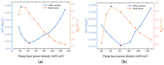 To further verify the above conclusions, we test the Allan variance under different pump laser power densities at vapor cell temperatures of 180 °C and 190 °C, as shown in Figure 5a,b, respectively. When the CM is kept stationary, the data acquisition system collects the output signal at a sampling rate of 200 Hz for a duration of 2 h. The collected data is then used to calculate the Allan variance. The values of at 100 s under different pump laser power densities are shown in Figure 5 by the diamonds. It can be seen that the pump laser power density corresponding to the minimum at 100 s (indicated by the red pentagrams) is greater than the pump laser power density at which the scale factor reaches its maximum (indicated by the green diamonds). This is consistent with our previous analysis, as the pump laser power density at which the scale factor is maximized does not correspond to the minimum system output noise. It can also be observed that the minimum at 100 s at 190 °C is lower than the minimum at 100 s at 180 °C. This is because the system output noise is lower at 190 °C.