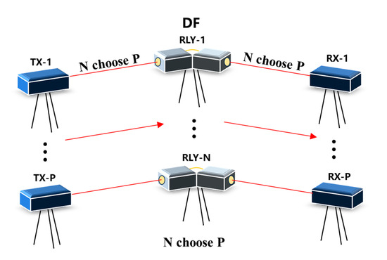 The system model of this paper is shown in Figure 1. In a multi-transceiver FSOC system with relays, there are P transmitting terminals (TX-1, …, TX-P), P receiving terminals (RX-1, …, RX-P), and N relay terminals (RLY-1, …, RLY-N). The red line represents the laser link. At any time, all the transmitting terminals will choose a different relay terminal as the relay node, which means that there are P parallel independent links in each time slot. In this paper, it is assumed that the relay terminals employ the DF method, and that all transmitting terminals and relay terminals adopt On–Off Keying (OOK) modulation in the NRZ format, chosen for its simple transceiver structure and balanced 0/1 signal characteristic, which simplify clock data recovery at the receiver. The Gaussian noise power between the transmit-relay and relay-receive terminals is and , respectively.
