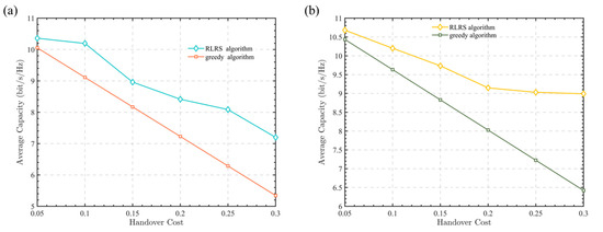 Figure 4 presents the average channel capacity curves under different handover loss conditions. Figure 4a,b describes the cases of 10 time slots and 50 time slots. As can be seen from Figure 4a,b, the proposed RLRS algorithm in this paper consistently outperforms the greedy algorithm under various handover loss conditions. Additionally, as the handover loss increases, the gap between the two algorithms gradually widens, with the RLRS algorithm providing at least a 2.47% improvement in channel capacity. This is because the conventional greedy algorithm only selects the relay node with the largest channel gain without considering handover loss. As a result, when the handover loss increases, its capacity decreases linearly. In contrast, the proposed RLRS algorithm in this paper takes both handover loss and channel gain into account, so as to maximize the long-term rewards of relay selection in each time slot.