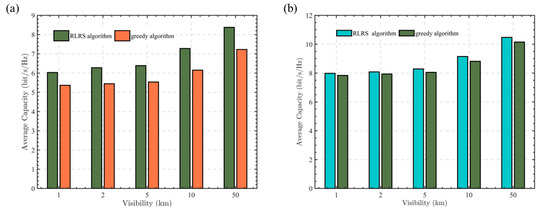 This paper selected the wavelength as 1550 nm. The visibility is set to 1 km, 2 km, 5 km, 10 km, 50 km, respectively. As shown in Figure 5a, which illustrates Malaga turbulence, the average capacity increases with visibility. This is due to the fact that greater visibility results in reduced attenuation. Figure 5b illustrates Gamma-Gamma turbulence with , , where the Malaga turbulence can reduce to Gamma-Gamma turbulence with and . As can be seen from Figure 5a,b, the RLRS algorithm always performs better than the traditional greedy algorithm. Besides the situation of weak turbulence, which has a larger average capacity in both the RLRS and greedy cases, Figure 5a,b also show that the RLRS algorithm performs more effectively under strong turbulence. This is because strong turbulence can cause significant variations in channel gains across multiple potential links. Consequently, during relay selection, the difference in system performance between high-quality and low-quality relays becomes more pronounced, leading to a more noticeable improvement in system performance with the RLRS algorithm.