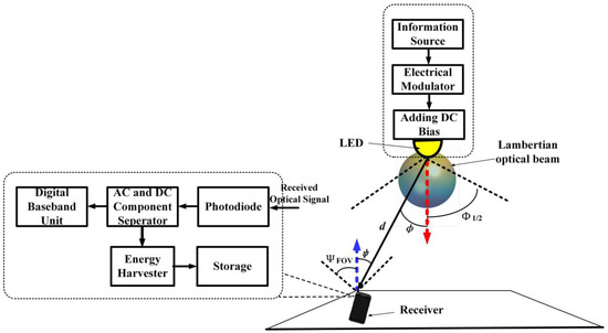 Visible light communication (VLC) is increasingly viewed as one powerful candidate solution to effectively mitigate and address the severe spectrum scarcity in the upcoming sixth-generation (6G) telecommunication networks [1,2,3,4,5]. Particularly, VLC can utilize ubiquitous light-emitting diode (LED)-based illumination infrastructures, which make it more competitive in capital expenditures (CAPEX) than setting one totally new radio frequency (RF) network [6,7,8,9,10]. At the same time, it must be noted that in evolving mobile networks, due to their relatively finite battery capacity, it is quite challenging for mobile terminals to provide consistent communication performance over long durations. For tackling this energy supply issue and exploring the power transfer potential of VLC, light-energy-harvesting-enabled VLC systems, also known as simultaneous lightwave information and power transfer (SLIPT) systems, are proposed and have gained lots of research interest [11,12,13,14,15]. In typical SLIPT, the emitted optical signals are utilized for data transmission and power transfer at the same time [16,17,18,19,20,21].