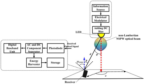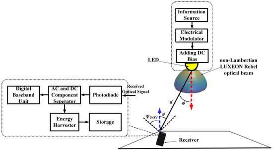 Nevertheless, unlike the effect of receiver aperture size, the harvested energy amount is independent of the emitted signal intensity since only the DC component but not the AC component, i.e., the emitted signal, is utilized for energy harvesting, as shown in Figure 7.