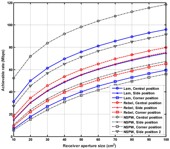 In this subsection, the receiver aperture effect on the performance of SLIPT adopting the distinct optical beam configuration is investigated. Regarding the achievable rate, as shown in Figure 4, for all cases, the achievable rate can be enhanced by increasing the receiver aperture size since more optical signal flux can be captured by the enlarged aperture area. Specifically, for the central position with the best channel condition, the non-Lambertian NSPW emission beam configuration can consistently provide a more superior transmission performance than the other two beam configurations via focusing more emitted optical intensity in the normal direction, while the counterpart of the LUXEON Rebel non-Lambertian beam configuration is lowest since more emitted optical intensity is inherently designed to light more ubiquitous surrounding directions but not the unusual normal direction. Numerically, when the receiver aperture size is 10 cm2, the achievable rates are 31.2 Mbps, 18.1 Mbps, and 52.3 Mbps for the cases of Lambertian, Rebel non-Lambertian, and NSPW non-Lambertian, respectively. An achievable data rate gain up to 21.1 Mbps can be provided by the proposed non-Lambertian NSPW SLIPT scheme. Once the receiver aperture size is increased to 100 cm2, the respective performance metric is enhanced to 95.8 Mbps, 79.7 Mbps, and 118.2 Mbps with increments of 64.6 Mbps, 61.6 Mbps, and 65.9 Mbps for the three cases. For the corner position, the non-Lambertian LUXEON Rebel beam configuration outperforms the other two beam configurations since more light power is emitted to these surrounding edge areas. As for the left case of the side position, when the original receiver aperture size of 10 cm2 is applied, the best performance of 27.1 Mbps is derived for the non-Lambertian NSPW emission beam configuration with the receiver located at side position 2 since the narrow cross-section of this beam naturally projects more power to this position; this is at the price of projecting limited power to the nearby side position with the worst performance of 10.4 Mbps. When the final receiver aperture size of 100 cm2 is applied, the achievable rate performance for side position 2 and the side position is gradually increased to 91.2 Mbps and 67.3 Mbps, respectively. Objectively, for the concerned positions, the minimum achievable rate difference, i.e., the achievable rate fluctuation, can be observed adopting the LUXEON Rebel beam configuration, while the most intense rate fluctuation can be identified for the case of the NSPW beam. Apparently, under the NSPW non-Lambertian configuration, since more emitted power is concentrated in the normal direction of the LED, more optical power can be accordingly captured by the receiver that is located at the normal-facing position, i.e., the center position.
