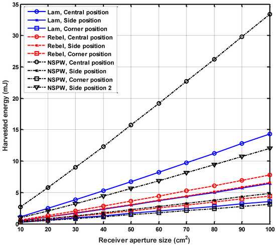 As for the performance of energy harvesting of SLIPT, a similar trend can be observed, as shown in Figure 5. It should be noted that there is a more obvious harvested energy gap between the different beam configurations for the same position. Specifically, for the center position, when the original receiver aperture size of 10 cm2 is applied, the harvested energy is 1.14 mJ, 0.61 mJ, and 2.69 mJ for the Lambertian emission beam configuration, the LUXEON Rebel beam configuration, and the NSPW beam configuration, respectively, with a harvested energy gap of 0.53 mJ between the Lambertian configuration and the LUXEON Rebel configuration and a harvested energy gap of 1.55 mJ between the NSPW configuration and the Lambertian configuration. A harvested energy gain of up to 1.55 mJ can be provided by the discussed non-Lambertian SLIPT scheme compared with the harvested energy of the benchmark Lambertian configuration. When the receiver aperture size is increased to 100 cm2, the harvested energy is enlarged to 14.3 mJ, 7.76 mJ, and 33.4 mJ for the three mentioned beam configurations, respectively, while a counterpart of 6.54 mJ in the harvested energy gap can be observed between the Lambertian configuration and the LUXEON Rebel configuration and a counterpart of 19.1 mJ in the harvested energy can be found between the NSPW configuration and the Lambertian configuration.