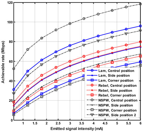 In this subsection, the effect of the emitted signal intensity on the performance of SLIPT adopting a distinct optical beam configuration is investigated. In the aspect of achievable rate performance, a similar trend can be observed. As shown in Figure 6, when the original emitted signal intensity in the electrical domain is 0.6 mA, the achievable rates are 31.2 Mbps, 18.1 Mbps, and 52.3 Mbps for the cases of Lambertian, non-Lambertian Rebel, and non-Lambertian NSPW, respectively, at the central position. Once the emitted signal intensity is linearly increased to 6 mA, the respective performance metric is enhanced to 95.8 Mbps, 70.7 Mbps, and 118.2 Mbps with an increment of 64.6 Mbps, 52.6 Mbps, and 65.9 Mbps for the three cases.