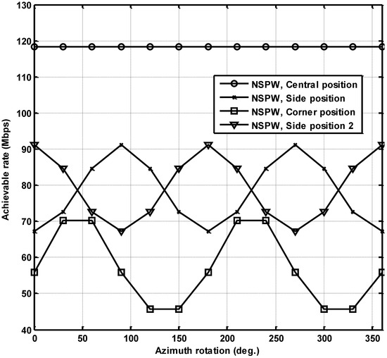 As for the left non-Lambertian NSPW configuration, an apparent nonrotational symmetry can be observed in Figure 3. Therefore, the performance of SLIPT adopting this unique optical beam configuration will be significantly affected by the manually manipulated azimuth rotation angle. Numerically, as shown in Figure 8, for the central position, the achievable rate performance is constant for all azimuth rotation angles since the receiver is on the normal axis of the LED transmitter, in other words, just under the transmitter mounted on the ceiling. For the left candidate receiver positions, obvious periodicity in the achievable rate performance can be observed with the increased azimuth rotation angle, as shown in Figure 8. Although the rotation angle cycle is 90° for the side position, corner position, and side position 2, a different achievable rate performance appears under the same azimuth rotation angle. Specifically, for the original azimuth rotation angle of 0°, a maximum achievable rate of 91.2 Mbps is obtained for side position 2, while a minimum achievable rate of 67.3 Mbps is obtained for the side position, which means that an achievable rate variation up to 23.9 Mbps can be realized by manipulation of the azimuth rotation angle. Then, with the azimuth rotation angle increased to about 50°, a respective maximum achievable rate of 70.2 Mbps is obtained for the corner position. Once the azimuth rotation angle is increased to about 90°, a maximum achievable rate of 91.2 Mbps is obtained for the side position. All these phenomena indicate that by manipulating the azimuth rotation angle of the NSPW non-Lambertian configuration, the achievable rate of the SLIPT system can be enhanced or degraded on purpose significantly. It must be noted that, in this work, the discussion is limited to the effect of the beam azimuth rotation on the distinct beam configurations, which could be unintentionally induced during the mounting of the LED transmitter on the ceiling surface. This fundamental investigation is essential, especially for the NSPW non-Lambertian configuration with the rotated asymmetrical radiation characteristic. As for the potential intentional manipulation of the azimuth rotation and the relevant method design, both are beyond the discussion scope of this article and can be left for future systematic investigations by incorporating micro-electromechanical systems, liquid crystals, metamaterials, or other enabling techniques.