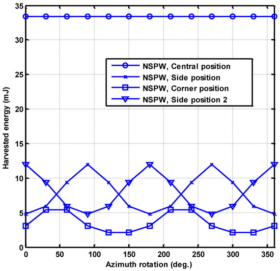As for the performance of energy harvesting for the SLIPT system, a similar variation can be observed as well, as illustrated in Figure 9. Specifically, for side position 2, a maximum harvested energy of 12.0 mJ and a minimum harvested energy of 4.84 mJ appear when the rotation angles of 0° and 90° are introduced separately, which means that an harvested energy variation up to 7.16 mJ can be realized by manipulation of the azimuth rotation angle. The metrics for this variation amplitude are 7.16 mJ and 2.31 mJ for the side position and corner position, respectively. A similarity can be observed between Figure 8 and Figure 9. The main cause for these phenomena is that SLIPT channels under the NSPW non-Lambertian configuration for DC and AC signal transmission are simultaneously analogously varied by the potential azimuth rotation. Hence, the harvested energy and the achievable transmission rate via the SLIPT channels are similarly varied accordingly.