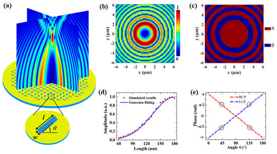 where is the Airy function, is the distance between the main lobe and the origin, is the radius, b is the scaling length, and is the truncation factor. In FDTD simulation, the parameters in Equation (1) are set to be a = 0.01, , and incident wavelength , with the designed focal length correspondingly to be about 11 μm. The calculated amplitude and phase distributions for such ring-Airy beam are given in Figure 1b and Figure 1c, respectively. We can see from Figure 1c that the phases contains values of 0 and π. Such a binary phase distribution is also the obvious requirement of Equation (1), that is, the phase distribution could be 0 for and π for , respectively.