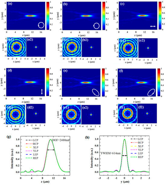 (a–f) Simulated longitudinal intensity distributions of the ring-Airy beams in the yz plane when the incident beam is (a) LCP, (b) RCP, (c) XLP, (d) YLP, (e) LEP, and (f) REP, respectively. (a1–f1) Corresponding transverse intensity distributions in the x-y planes at z = 1 μm behind the metasurface; (a2–f2) Corresponding transverse intensity distributions at the focal plane (z = 11 μm); (g) and (h) Intensity distributions along the lines y = 0 and x = 0 through the focus. The wavelength of the incident light is set as 633 nm.