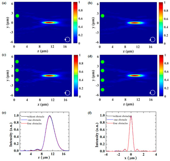 Self-healing is an intrinsic feature of Airy beam; that is, the beam would reconstruct itself without influence in the propagation after it overcomes the obstacles. In order to verify the self-healing feature of the Airy beams, we place sphere obstacles with a diameter of 800 nm along the y axis, as shown in Figure 3, where the obstacles are represented by green circles. Figure 3a,b show the intensity distributions with one obstacle placed on the main lobe, under incidence of LCP and RCP light, respectively. We can see that the beams are scattered by the obstacle but then reconstructed after passing it. In Figure 4a,b, four obstacles are placed with a spacing distance of 3 μm. Due to the self-healing ability, both scattering and reconstructing of the beams are still being observed. Figure 3e,f show the intensity profiles along the z-axis and y-axis in the corresponding focal planes. The black, blue, and red lines represent the intensity profiles with no obstacle, one obstacle, and four obstacles, respectively. Both the focal length of the metasurface and the FWHM of the beams show no visible difference under the three cases. These phenomena indicate the robust self-healing feature of the generated beam and the proposed metasurface.