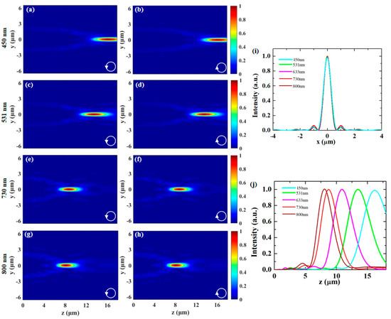 Intensity distributions for (a,b) 450 nm, (c,d) 531 nm, (e,f) 750 nm, and (g,h) 800 nm incident light with LCP and RCP, respectively. (i) Corresponding normalized intensity profiles along the x-axis, and (j) Corresponding normalized intensity profiles along the z-axis.
