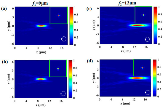 In addition, we realize the flexible control of the focal length of the ring-Airy beam by adjusting the parameters (r0, b, a = 0.01). Two metasurfaces with focal lengths f1 = 9 µm and f2 = 13 µm are designed with parameters , and , , respectively. Figure 5a–d shows the intensity distributions generated by the two types of metasurface, under LCP and RCP incidence, respectively. The insets show the corresponding intensity distributions at the focal planes. Focal spots at z = 9 μm and 13 µm are obtained for the two cases, which is as expected in the design. For LCP and RCP light, the autofocusing of the transmitted waves shows little dependence on the incident polarizations. It is obvious that polarization-independent ring-Airy beams with different focal lengths can be generated by changing parameters (r0, b, a) of the metasurface.