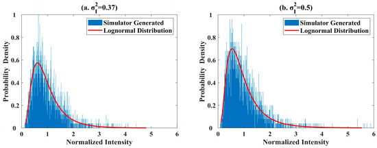 Probability density function of the modeled turbulence channel. (a) = 0.37, (b) = 0.5.