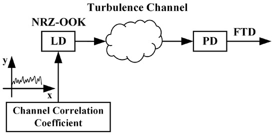 where is the maximum allowable transmitting power, is an adaptation factor obtained from the fluctuation strength of the received uplink or downlink transmission signal, is the initial transmitting power, and is the minimum value taken from and . The modulated optical NRZ-OOK signal after a power adjustment is emitted into the turbulence channel by a 1550 nm wavelength laser diode (LD) for reverse transmission. At the receiving end of the reverse transmission, the photodiode (PD) detects the transmitted optical signal and performs photoelectric conversion. The received electrical signal after PD is represented by