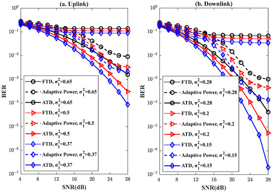Figure 4 and Figure 5 demonstrate the comparison of the BER performance of the proposed technique with FTD and ATD techniques under different turbulence intensities for 30 km and 40 km FSO links, respectively. This paper focuses on the BER performance of the proposed technique for distance transmissions of 30 km and 40 km. The BER performance of the proposed technique at shorter transmission distances will be discussed in a subsequent study. Figure 4a and Figure 5a illustrate the comparison of the BER performance of the three techniques for uplink transmission. Figure 4b and Figure 5b present the comparison of the BER performance of the three techniques for downlink transmission. It is obviously seen that the BER performance of the proposed technique is significantly better than the FTD technique, and it is close to the ATD technique under different link distances and turbulence intensities. The FTD technique uses the same threshold to determine the received signal, and it is unable to more accurately determine the received signal with unstable power due to changes in channel conditions. The BER floor remains flat even if the SNR is high. Therefore, the proposed adaptive power transmission technique is investigated, and it is easier to decide the signal at the receiving end by the FTD technique. The reason is that the detected optical power at the receiving end is improved by adapting the power of the transmitted signal. As shown in Figure 3, although a correlation is observed between the corresponding uplink and downlink turbulence channels, there is a difference in the time domain fluctuations during uplink and downlink signal transmissions. And the proposed technique is not able to cope well with the severe signal strength degradation within the channel at certain moments due to the limitation of the transmitted power. However, the ATD technique is able to adapt better to different channel conditions by dynamically adjusting the threshold at the receiver side via CSI. Therefore, the BER of the proposed technique is lower than the BER of the ATD technique. But the CSI used in the ATD technique is the comprehensive description of the whole channel state, including the information of signal scattering, environmental fading, distance decay, etc., which makes it difficult to obtain the accurate CSI in a real system. In contrast, the signal fluctuation strength is a relatively simple measurement that directly reflects the power level of the received signal. The proposed technique combines signal fluctuation strength and channel correlation coefficient to improve the transmitted power, which reduces the system complexity and improves the system energy efficiency. In addition, the BER performance of the uplink transmission is more similar to the BER of the ATD technique compared to the downlink transmission. This is because the uplink transmission is usually subject to greater signal fluctuations caused by atmospheric turbulence. The BER performance of the uplink transmission is more easily improved by adjusting the power of the transmission signal. Therefore, the proposed adaptive power transmission technique effectively compensates for the turbulence scintillation effect, and it needs to be further studied in the future.