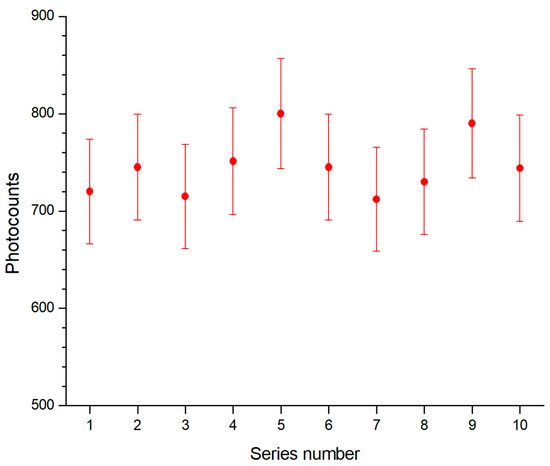 To assess the contribution of variations in the surface concentration of a trace in the samples to the error of subsequent measurements, the repeatability of the technology for creating a given concentration of TNT traces on the surface of an object was first checked. The level of the surface concentration fluctuations was assessed based on the results of processing the LIF signals recorded in the photon counting mode in ten successive accumulation series over 100 laser pulses (Figure 3). Assuming Poisson statistics for the distribution of photocounts, the error of the measurement results was calculated at a confidence level of 95%. It has been established that the relative theoretical error (coefficient of variation) of each measurement due to the Poisson statistics of the number of photocounts is about 7%. The empirical coefficient of variation for ten series of measurements was 4%, which indicates that variations in the surface concentration of the trace in the samples do not exceed the errors in the photocounts statistics.