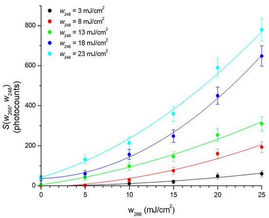 The obtained dependences of the LIF intensity of NO fragments S(w266, w248) on the energy density of the fragmenting radiation w266 at fixed energy densities of the probing radiation w248 are presented in Figure 5. It can be seen from the figure that with the increasing w of both lasers, a monotonic increase in the LIF intensity is observed. The colored lines in the figure show quadratic approximations of the obtained data. The approximation reliability coefficient is R2 > 0.98.