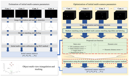 The proposed multi-camera calibration method integrates static and dynamic processes, enhancing both accuracy and usability. Initially, images of a three-axis calibration frame are synchronously acquired from all cameras. These images undergo binary conversion; markers are identified, matched, and labeled in accordance with the structure of the three-axis frame. Using normalized DLT, initial camera matrices are derived. Subsequently, a calibration wand is employed to gather approximately 1000 frames of data, which are then binarized; markers are detected and matched utilizing a proposed modified algorithm. A comprehensive cost function is formulated, incorporating static errors (3D coordinate, distance, angle, and reprojection errors) and dynamic errors (distance errors from wanding data). The AIRLS method optimizes the camera matrices, ensuring a balance between static and dynamic errors. The final intrinsic, extrinsic, and distortion parameters for each camera are extracted from the optimized matrices, facilitating precise multi-view triangulation and tracking. By integrating multiple error components, balanced optimization, and a robust matching algorithm, this method significantly enhances both accuracy and robustness. Figure 1 illustrates the detailed workflow of the proposed method.