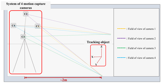 In this experiment, we utilized four CMOS cameras (OptiTrack FLEX 13; Natural Point, Corvallis, OR, USA) synchronized using a synchronization module (OptiHub2; Natural Point, Corvallis, OR, USA). The cameras were mounted on a custom-built multi-camera stand in a cross-axis configuration, with each camera positioned approximately 1 m apart to ensure a sufficient field of view for object tracking. Each camera featured a resolution of 1280 × 1024 pixels and operated at a frame rate of 120 Hz. The activities of multi-camera calibration and object tracking were conducted approximately 2 m from the center of the multi-camera stand, as depicted in Figure 2.