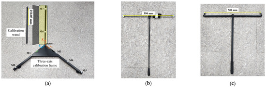 For further evaluation and validation of the proposed algorithm, tracking data were gathered using commercial motion capture system wands, such as the 390 mm commercial calibration wand (Vicon Motion Systems, Oxford, UK), illustrated in Figure 3b, with a marker center distance of 390 mm, and the 500 mm commercial calibration wand (Natural Point, Corvallis, OR, USA), illustrated in Figure 3c, with a marker center distance of 500 mm. The validation data consisted of approximately 1000 frames, with each trial being repeated five times to confirm the robustness of the results.