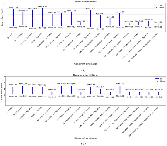 Among the static error components and their combinations, the combinations of 3D coordinate errors, distance errors and reprojection errors and of 3D coordinate errors, distance errors, angle errors, and reprojection errors produced the best results for static error statistics (Figure S1a). Both combinations resulted in a mean static error of 0.18 mm. However, 3D coordinate errors, distance errors, angle errors, and reprojection errors showed slightly better performance in terms of variability, with a standard deviation of 0.10 mm compared to 0.11 mm for 3D coordinate errors, distance errors, and reprojection errors. Additionally, 3D coordinate errors, distance errors, angle errors, and reprojection errors had a smaller minimum static error of 0.01 mm and a lower maximum static error of 0.41 mm, indicating more consistent accuracy across different test cases. While combinations such as distance errors and reprojection errors (mean: 0.23 mm, std: 0.16 mm) and distance errors and angle errors (mean: 0.32 mm, std: 0.27 mm) also showed relatively low static errors, 3D coordinate errors, distance errors, angle errors, and reprojection errors demonstrated the best overall performance in terms of both low mean error and low error spread.